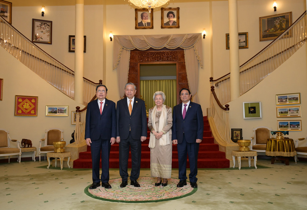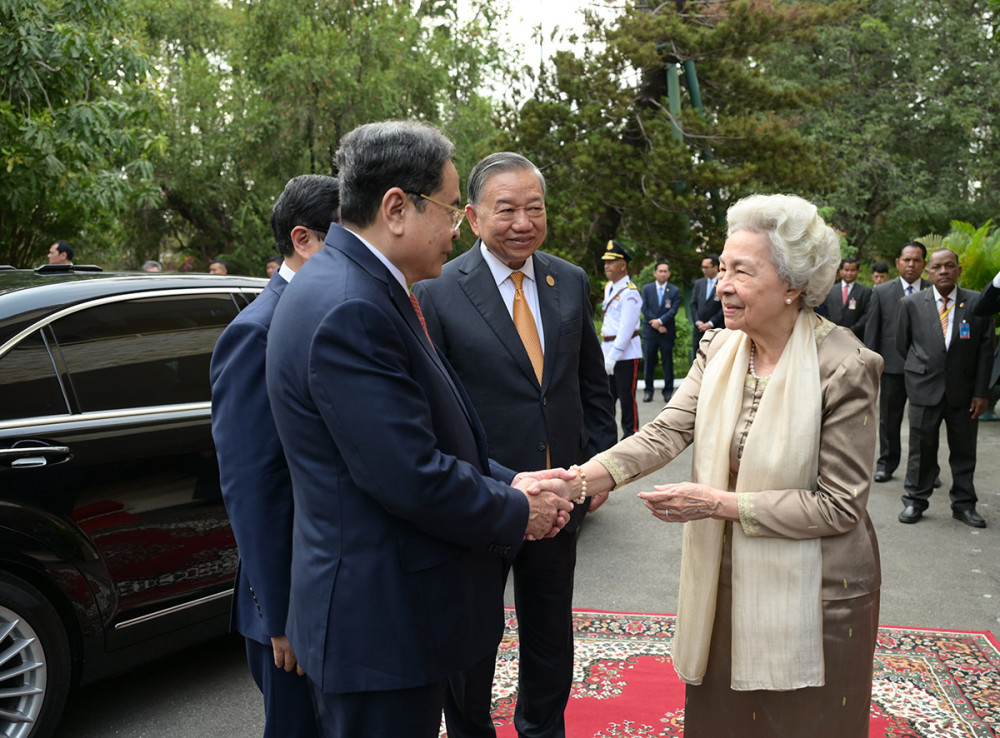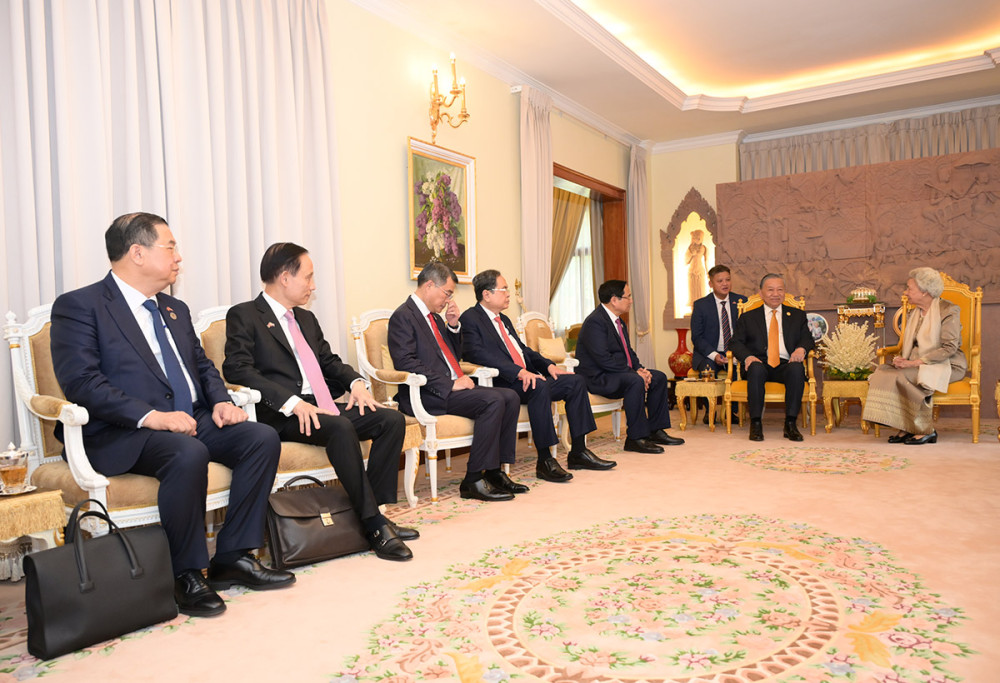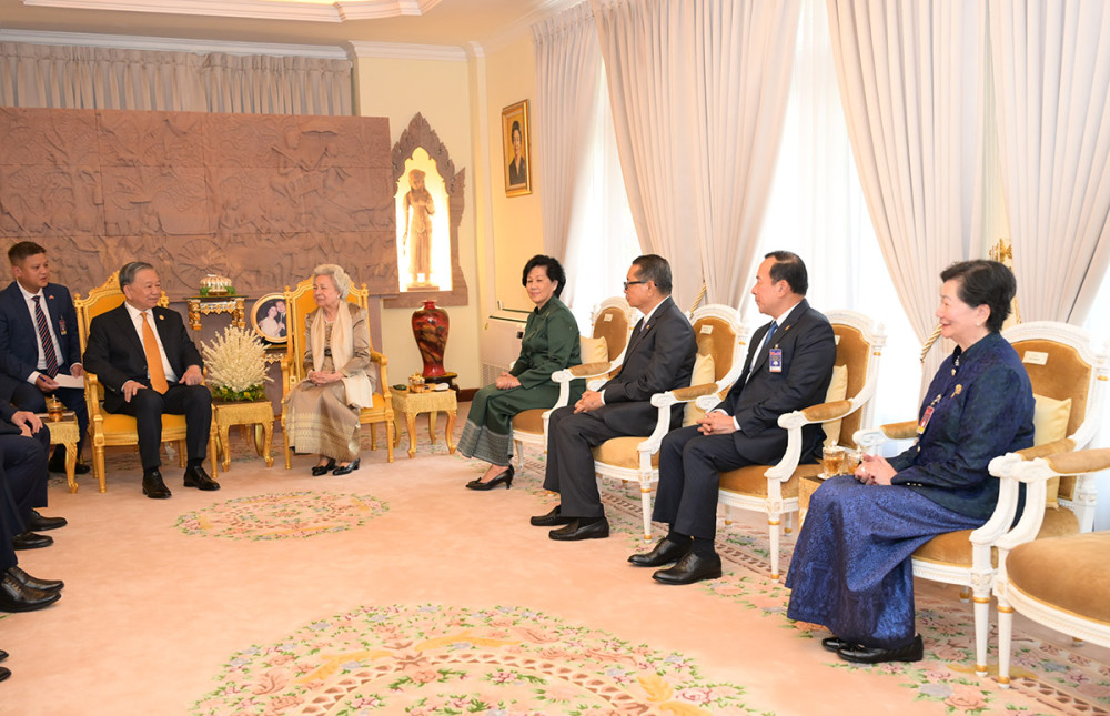 Her Majesty Norodom Monineath Sihanouk (L, Pic. 1), the Queen Mother of Cambodia, greets visiting H.E. To Lam (R, Pic. 1), General Secretary of the Communist Party of Vietnam, Vietnamese Prime Minister H.E. Pham Minh Chinh (L, Pic. 2) and Vietnamese National Assembly President H.E. Tran Thanh Man (L, Pic. 3), prior to a Royal Audience at the Royal Palace in Phnom Penh this morning.