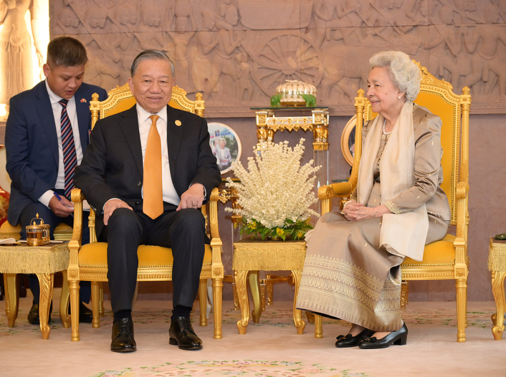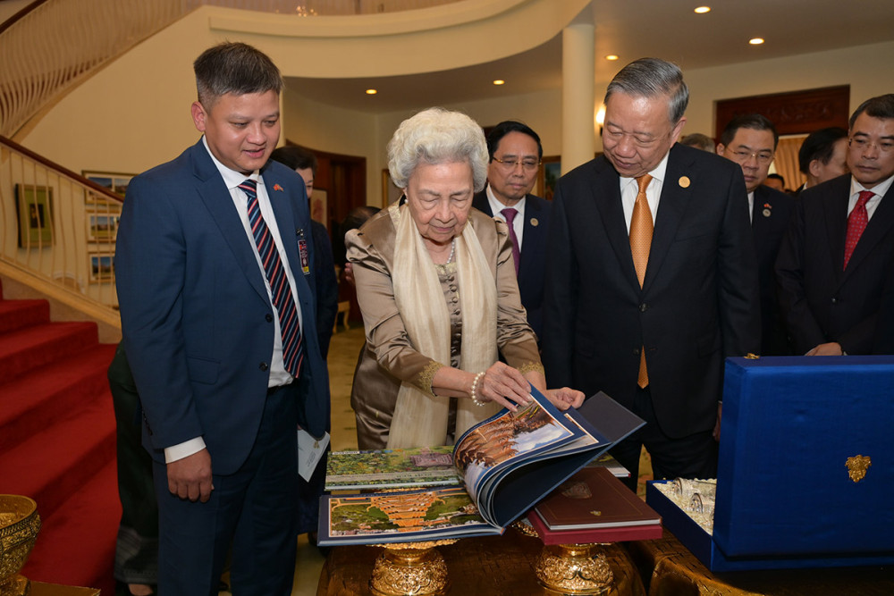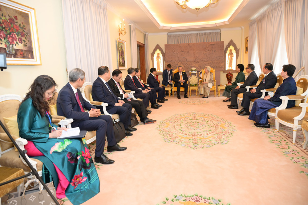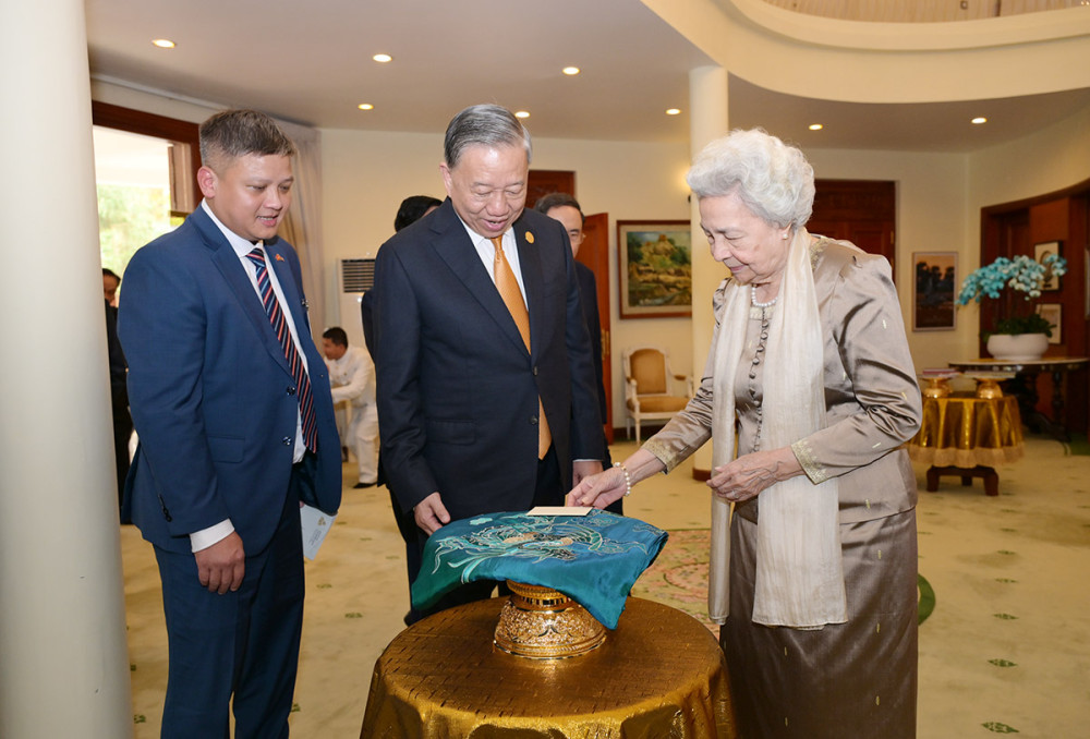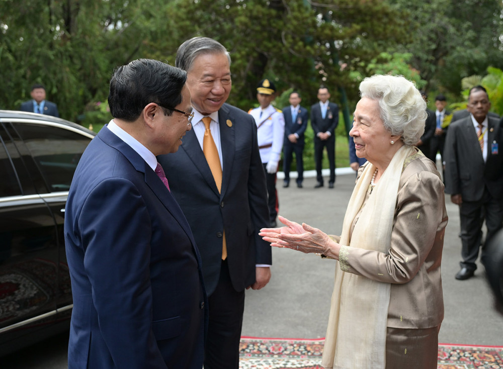 Her Majesty Norodom Monineath Sihanouk (L, Pic. 1), the Queen Mother of Cambodia, greets visiting H.E. To Lam (R, Pic. 1), General Secretary of the Communist Party of Vietnam, Vietnamese Prime Minister H.E. Pham Minh Chinh (L, Pic. 2) and Vietnamese National Assembly President H.E. Tran Thanh Man (L, Pic. 3), prior to a Royal Audience at the Royal Palace in Phnom Penh this morning.