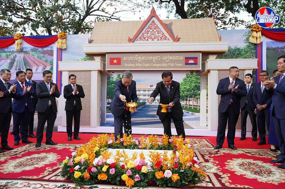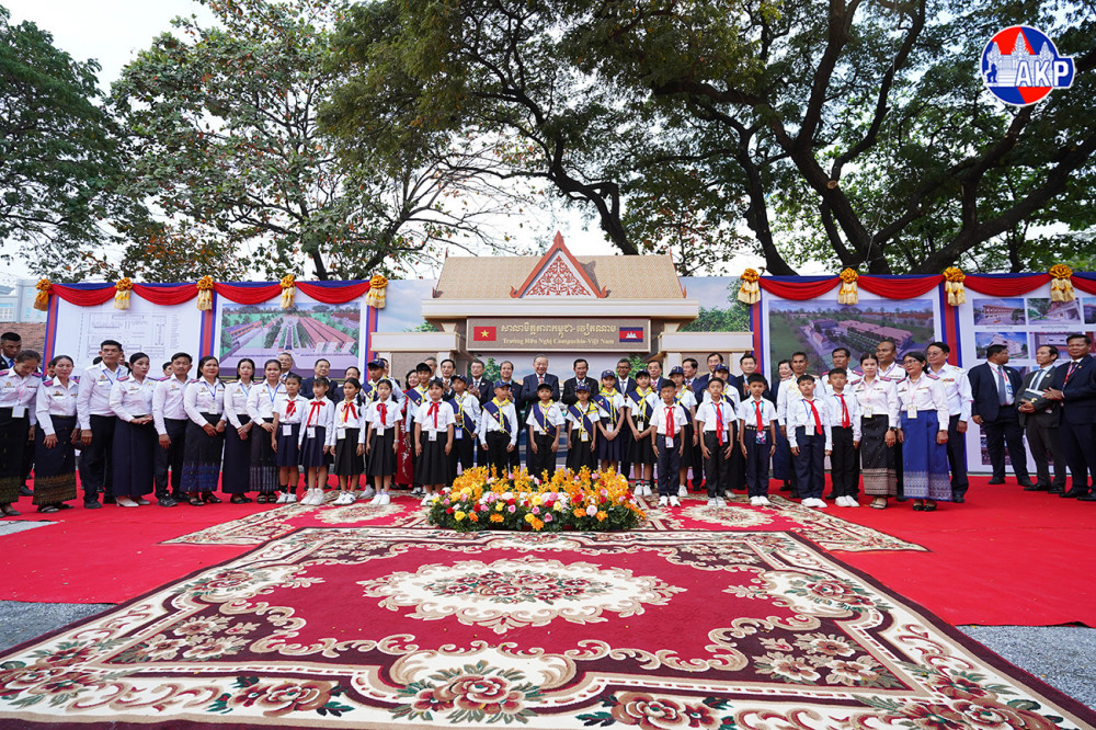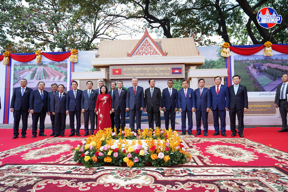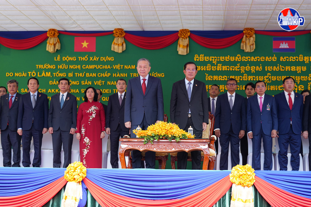 Samdech Akka Moha Sena Padei Techo Hun Sen (R Front, Pic. 1), President of the Cambodian People’s Party (CPP) and President of the Senate, visiting H.E. To Lam, General Secretary of the Communist Party of Vietnam, preside over a groundbreaking ceremony for the construction of Cambodia-Vietnam Friendship School Building in Khan Dangkor, Phnom Penh this afternoon.