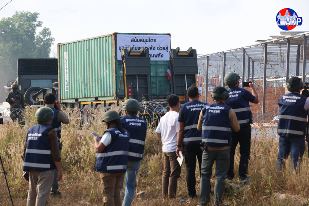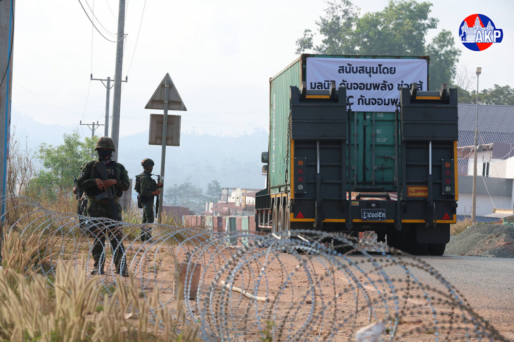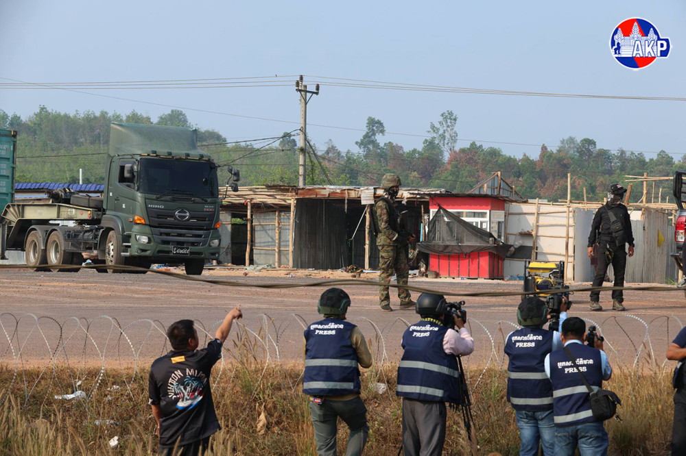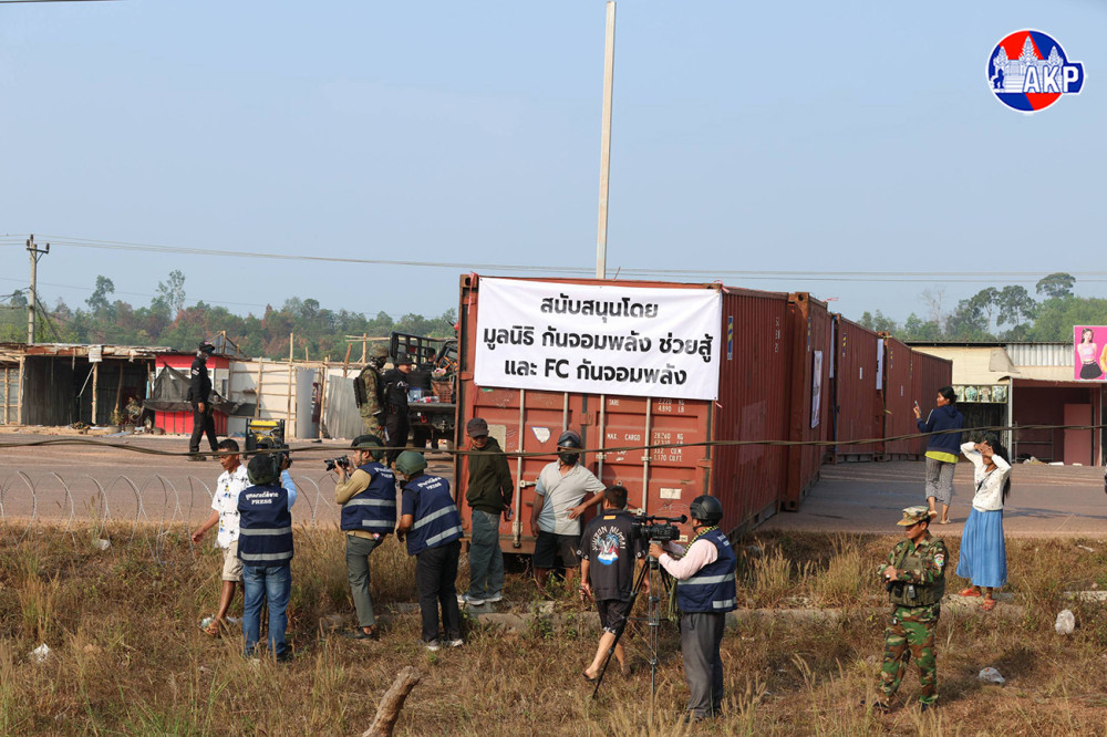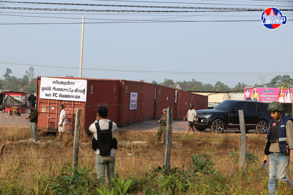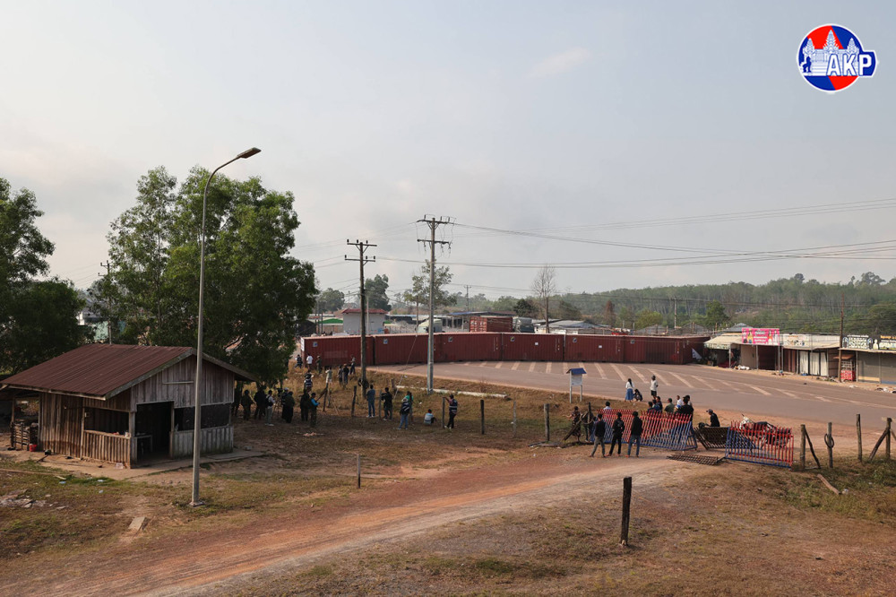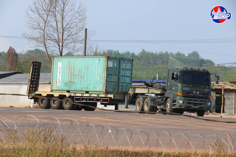 New shipping containers are lined up across National Road No. 55 by Thai invading troops in the early morning of Feb. 7, effectively encircling Cambodian land in Thmar Da commune, Veal Veng district, Pursat province.
