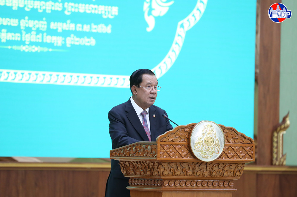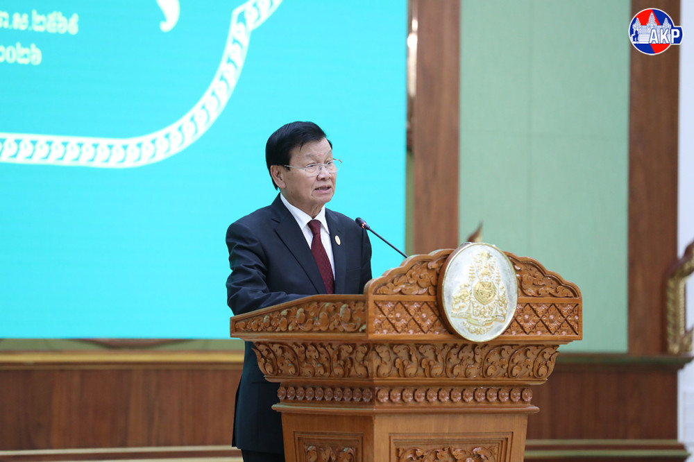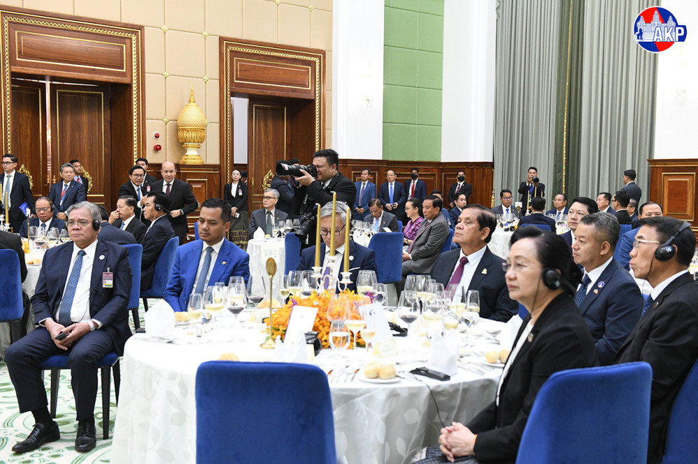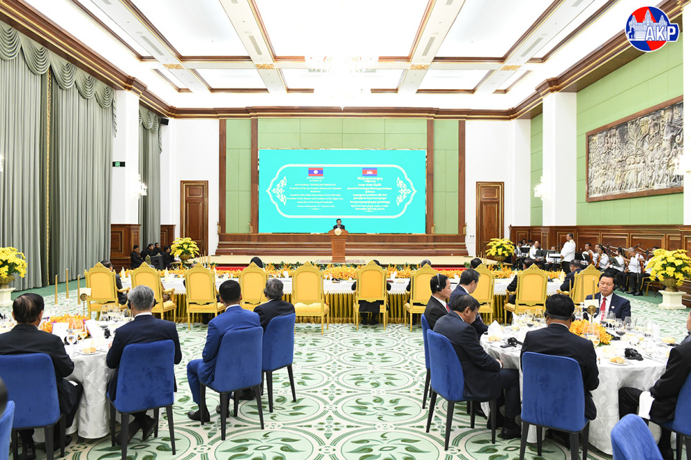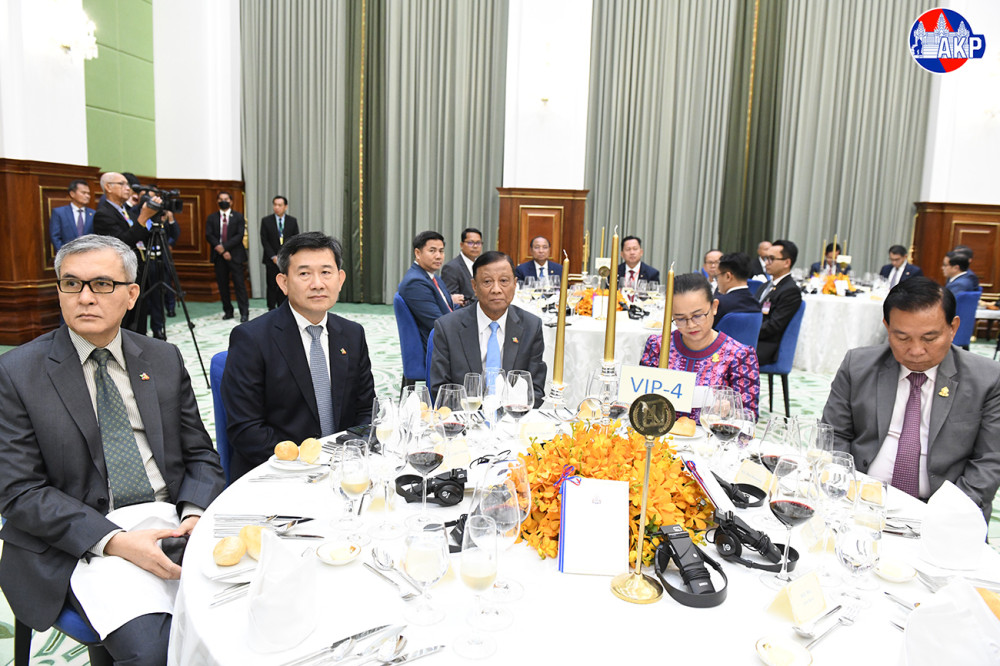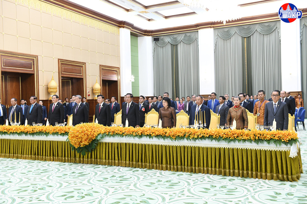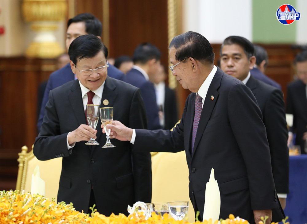 Samdech Akka Moha Sena Padei Techo Hun Sen (R, Pic. 1), President of the Senate and President of Supreme Privy Council to His Majesty Preah Bat Samdech Preah Boromneath Norodom Sihamoni, King of Cambodia, acting as the high representative of the His Majesty the King, toasts with H.E. Dr. Thongloun Sisoulith, General Secretary of the Lao People’s Revolutionary Party and President of the Lao People’s Democratic Republic, at a State Banquet in honour of the visiting high-level Lao delegation, at the Solidarity Palace in Phnom Penh today.