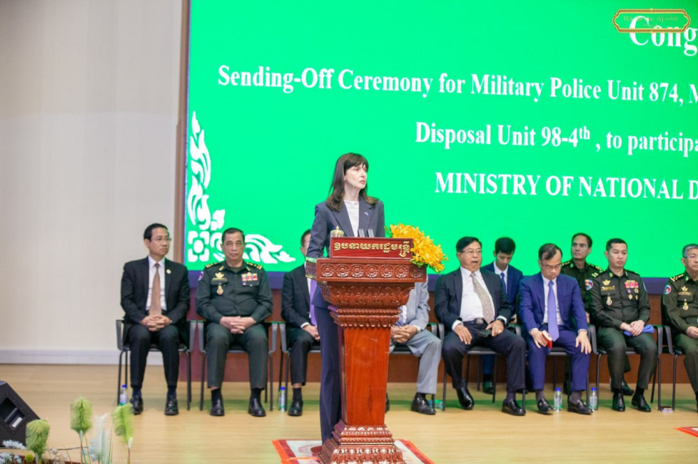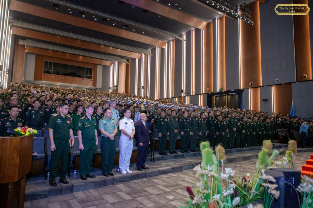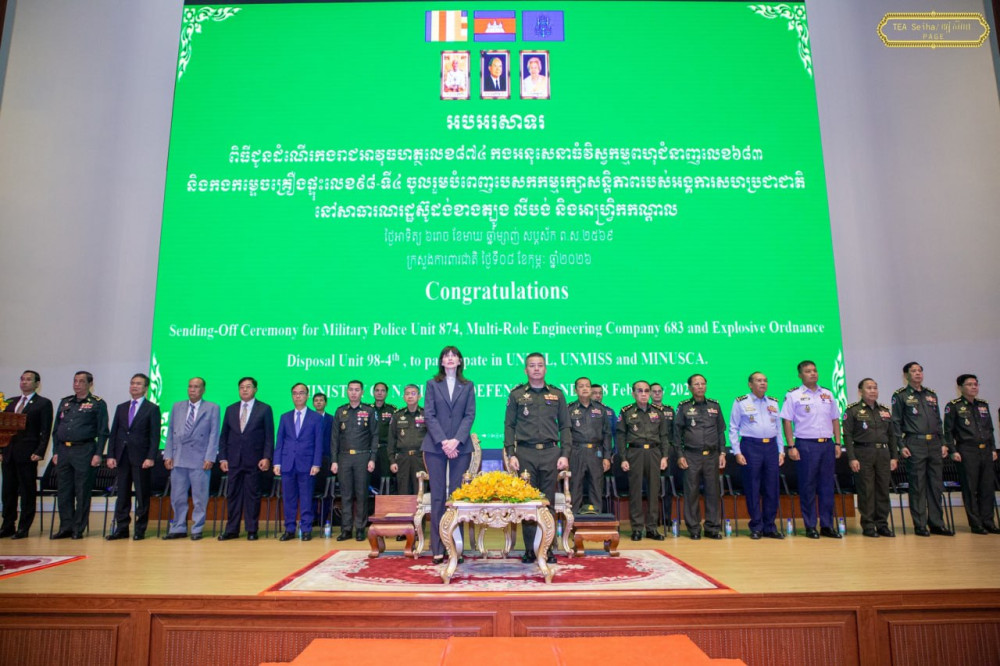 Cambodia’s Deputy Prime Minister and Minister of National Defence H.E. Gen. Tea Seiha (Pic. 1) delivers his remarks while he and new UN Resident Coordinator in Cambodia H.E. Ms. Vladanka Andreeva were presiding over this morning at the Ministry the Send-Off Ceremony for Military Police Unit 874, Multi-Role Engineering Company 683 and Explosive Ordnance Disposal Unit 98th-4th, to participate in the United Nations peacekeeping missions in the Republic of South Sudan, Lebanon and Central Africa.