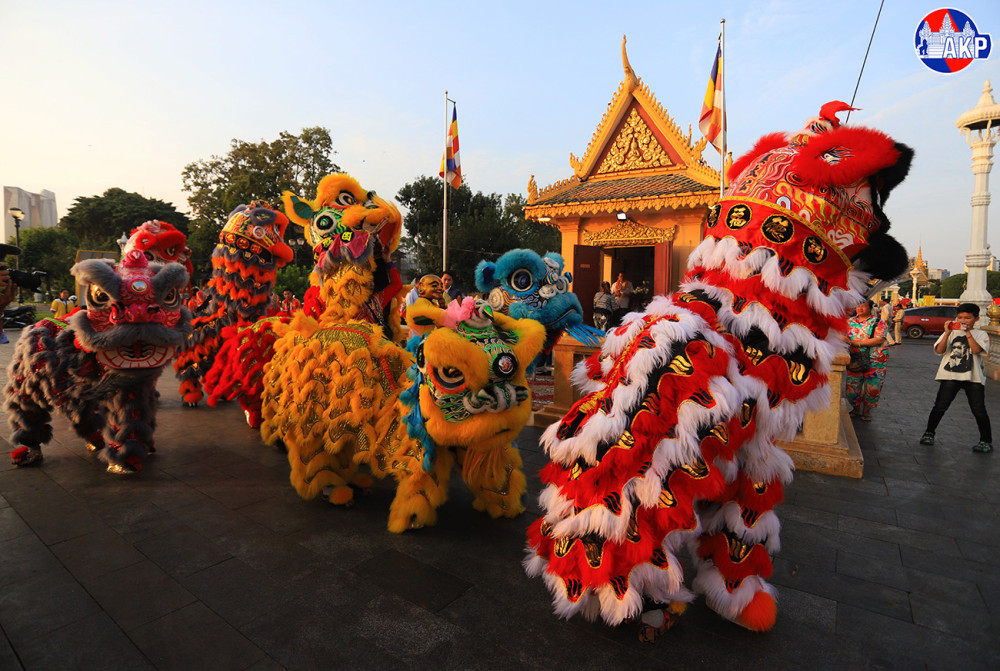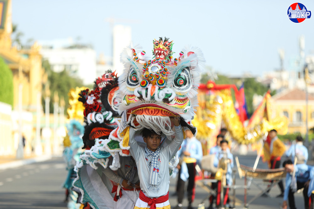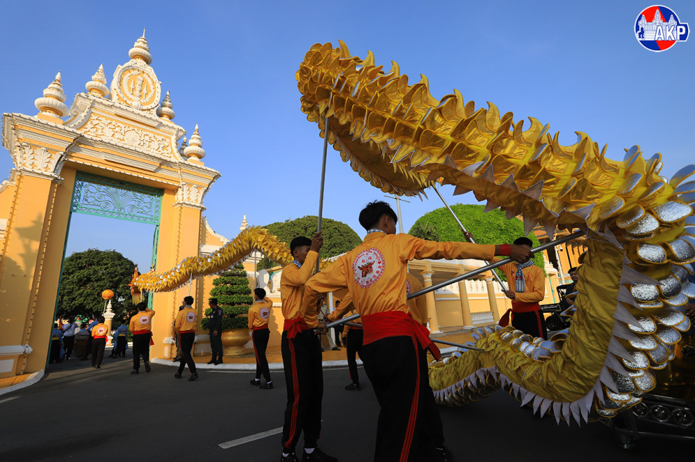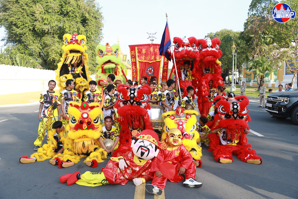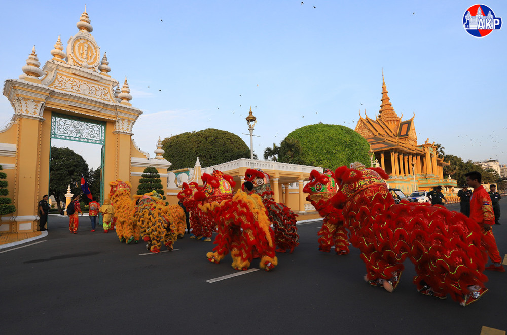 Eight lion and dragon dance troupes take part in ritual performances and offerings to Preah Ang Dangker and other deities in front of the Royal Palace’s Prasat Tevea Vinichay in Phnom Penh this morning on the occasion of the 2026 Chinese New Year celebrations.