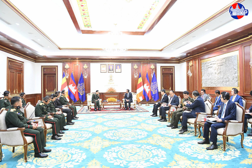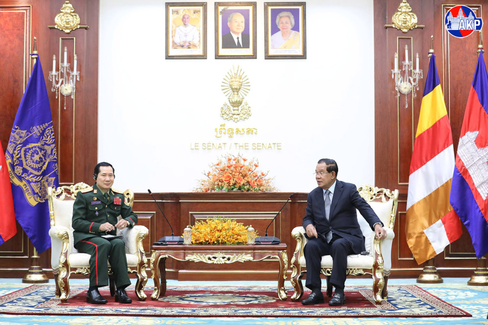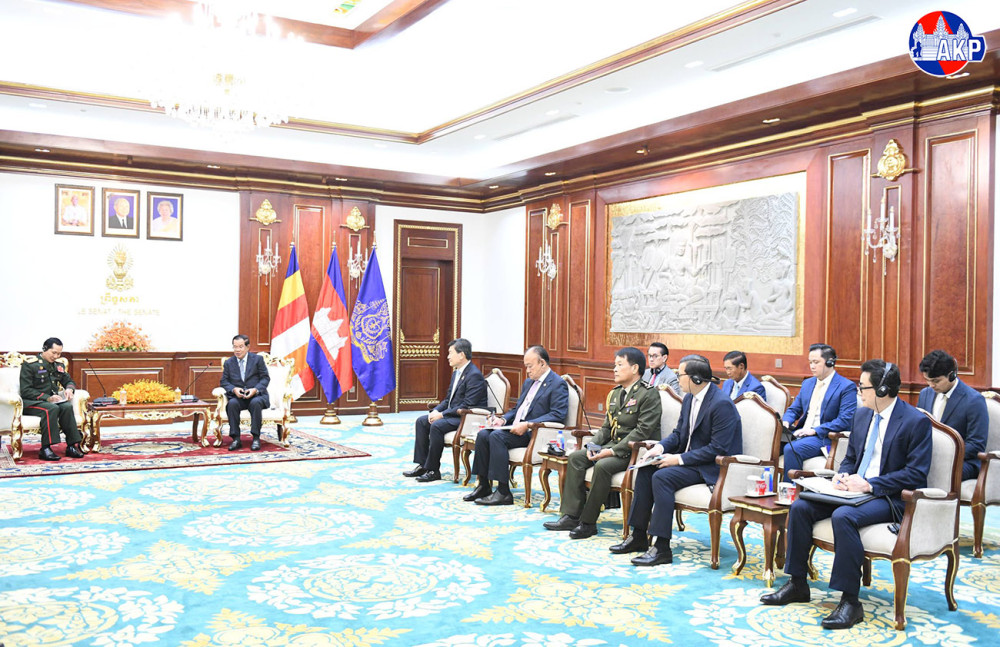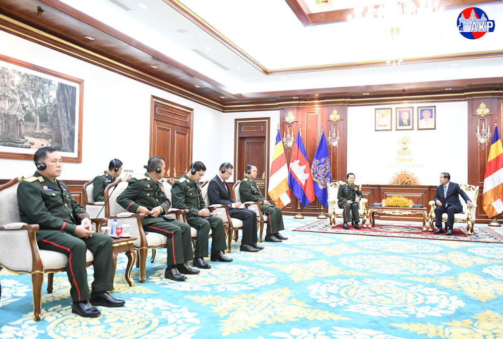 Samdech Akka Moha Sena Padei Techo Hun Sen (R, Pic. 1), President of the Senate of the Kingdom of Cambodia, greets visiting H.E. Lt. Gen. Saichay Kommasith, Deputy Minister of National Defence and Chief of the General Staff of the Lao People's Army, prior to their courtesy meeting at the Senate’s Solidarity Palace in Phnom Penh this morning.