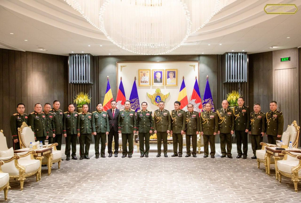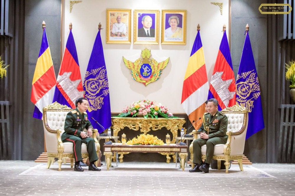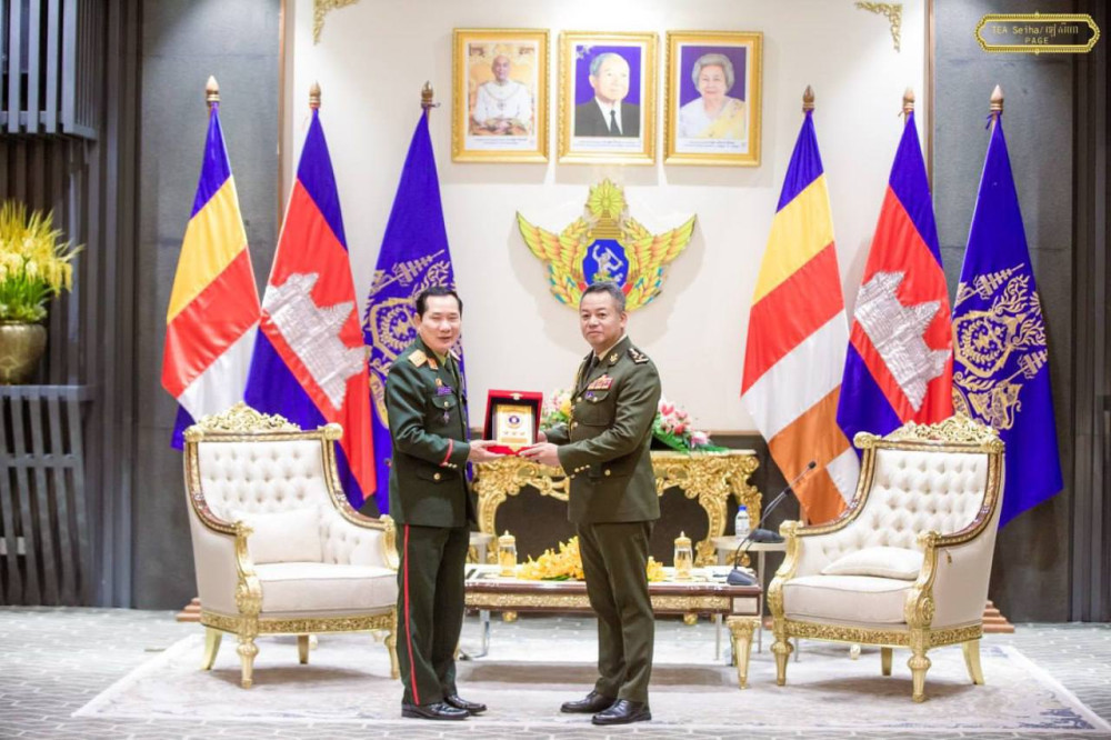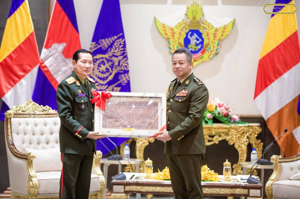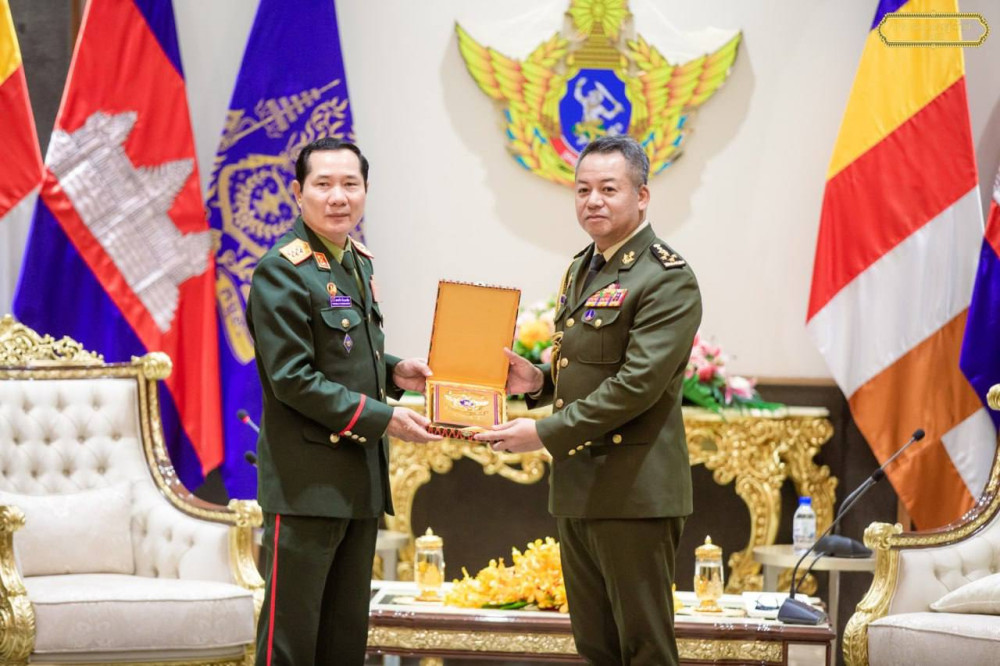 Cambodia’s Deputy Prime Minister and Minister of National Defence H.E. Gen. Tea Seiha (R, Pic. 1) poses for a photo with visiting H.E. Lt. Gen. Saichay Kommasith, Deputy Minister of National Defence and Chief of the General Staff of the Lao People's Army, at their courtesy meeting at the Ministry in Phnom Penh this morning.