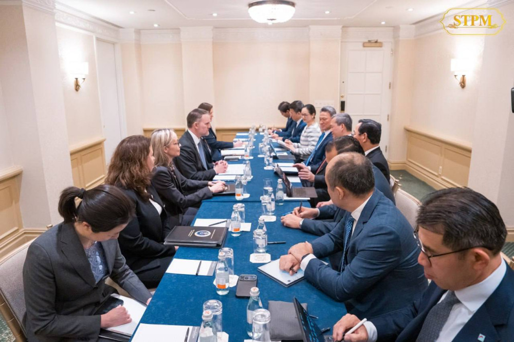 Cambodia’s Prime Minister Samdech Moha Borvor Thipadei Hun Manet (R, Pic. 1) shakes hands with H.E. Ambassador Jamieson Greer, United States Trade Representative, prior to their meeting in Washington D.C. on the afternoon of Feb. 18 (U.S. time), on the sidelines of the inaugural meeting of the Board of Peace.