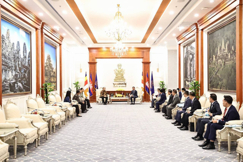 H.E. Abhisantibindit Sar Sokha (R, Pic. 1), Deputy Prime Minister and Minister of Interior, receives H.E. Dr. Santo Darmosumarto, outgoing Ambassador of the Republic of Indonesia to the Kingdom of Cambodia, in a farewell meeting at the Ministry of Interior this afternoon.