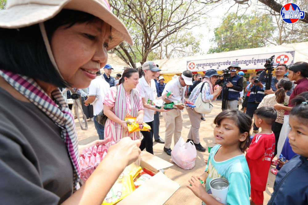 A delegation of foreign diplomats and representatives of international agencies accredited to Cambodia, led by H.E. Mrs. Eat Sophea, Acting Minister of Foreign Affairs and International Cooperation, this morning inspects the situation of displaced persons at the Wat Chan Sy Samaki Ratanaram Safety Centre, located in Kob commune, O’Chrov district, Banteay Meanchey province.