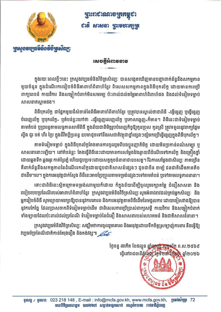 The Ministry of Culture and Fine Arts expressed its hope that a collective effort to respect and preserve these traditions will ensure the continued vibrancy and longevity of Cambodia's national cultural heritage.