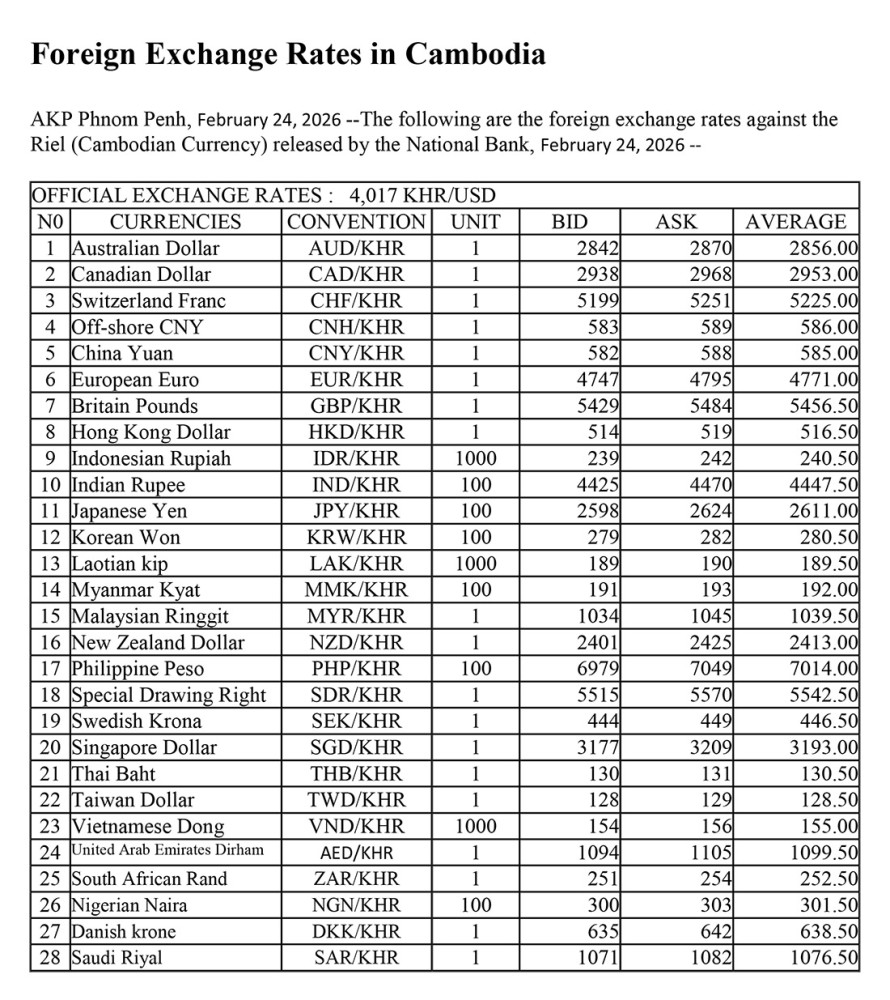 AKP Phnom Penh, February 24, 2026 --The following are the foreign exchange rates against the Riel (Cambodian Currency) released by the National Bank, February 24, 2026 --