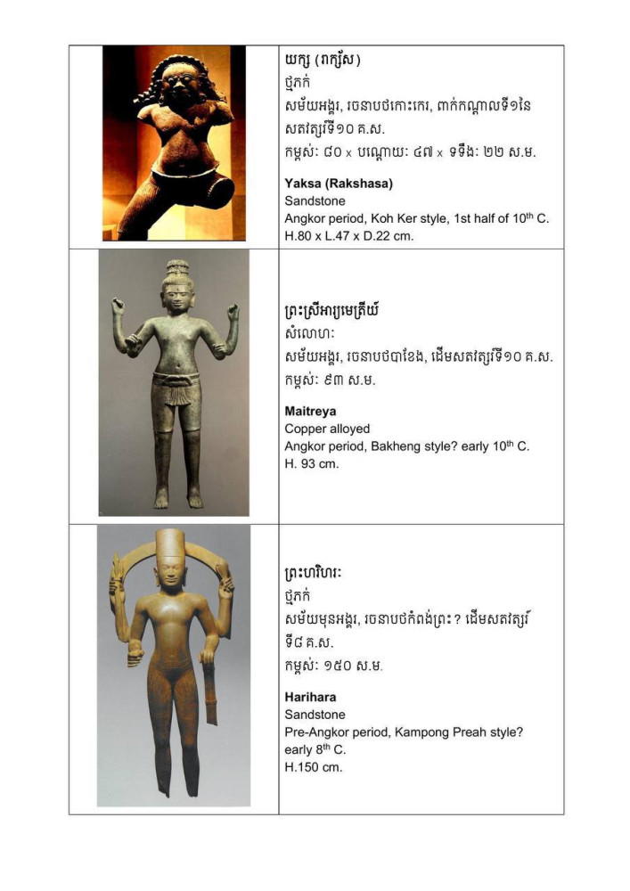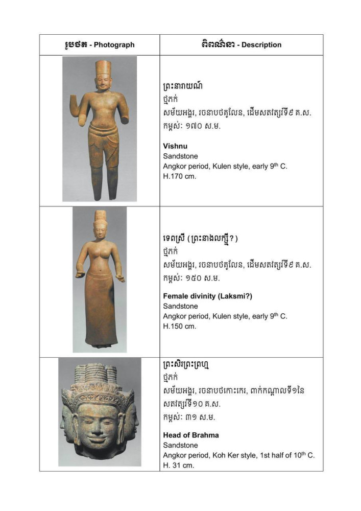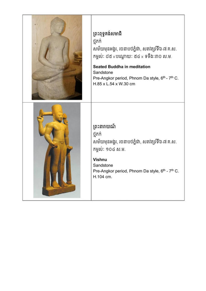 The artifacts date from the pre-Angkorian period to the height of the Angkorian Empire and include sandstone and metal sculptures as well as ritual objects. Among the most significant pieces are two rare early 9th-century sandstone sculptures from the reign of King Jayavarman II, believed to originate from Phnom Kulen and commonly referred to as the “divine couple.” Based on available evidence, the female figure is considered a rare masterpiece of the Kulen style.