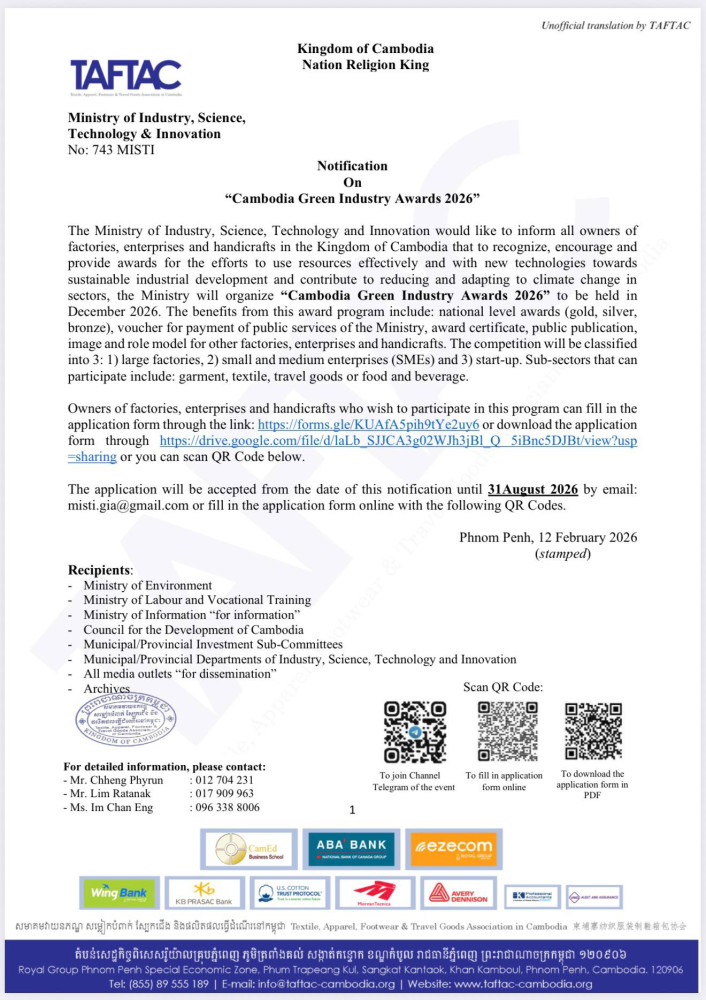 AKP Phnom Penh, February 28, 2026 —The Ministry of Industry, Science, Technology and Innovation (MISTI) has issued a notification announcing the organisation of the Cambodia Green Industry Awards 2026, which will be held in December 2026.