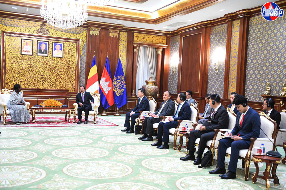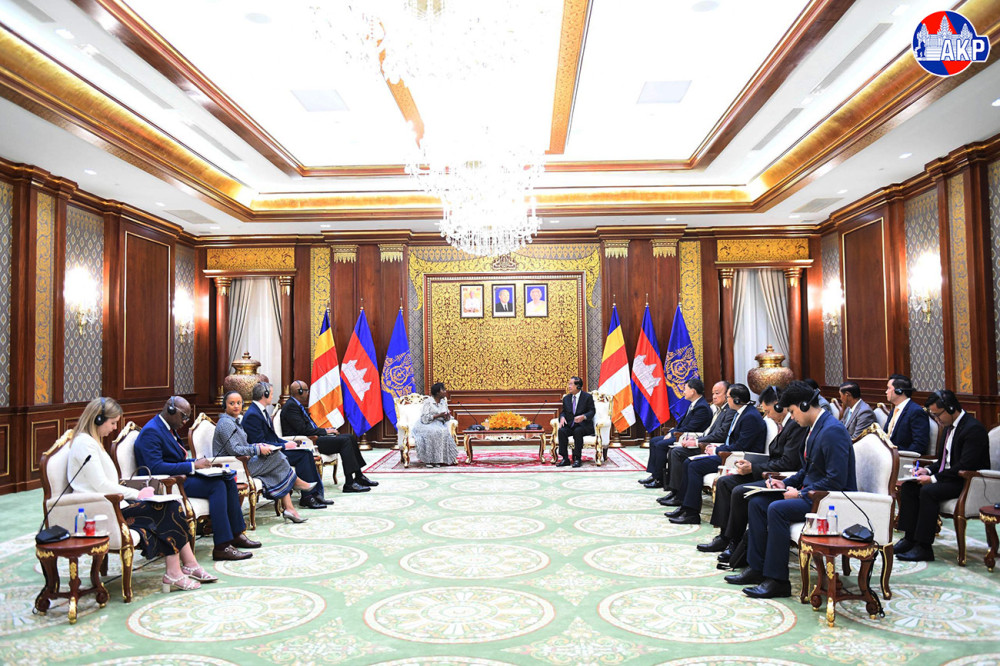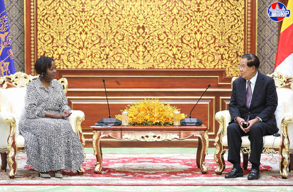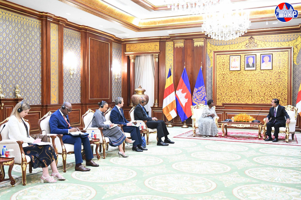 Cambodia’s Acting Head of State, Samdech Moha Sena Padei Techo Hun Sen (R, Pic. 1), greets visiting H.E. Ms. Louise MUSHIKIWABO, Secretary-General of the International Organisation of La Francophonie (OIF), prior to their meeting at the Solidarity Palace in Phnom Penh this morning.
