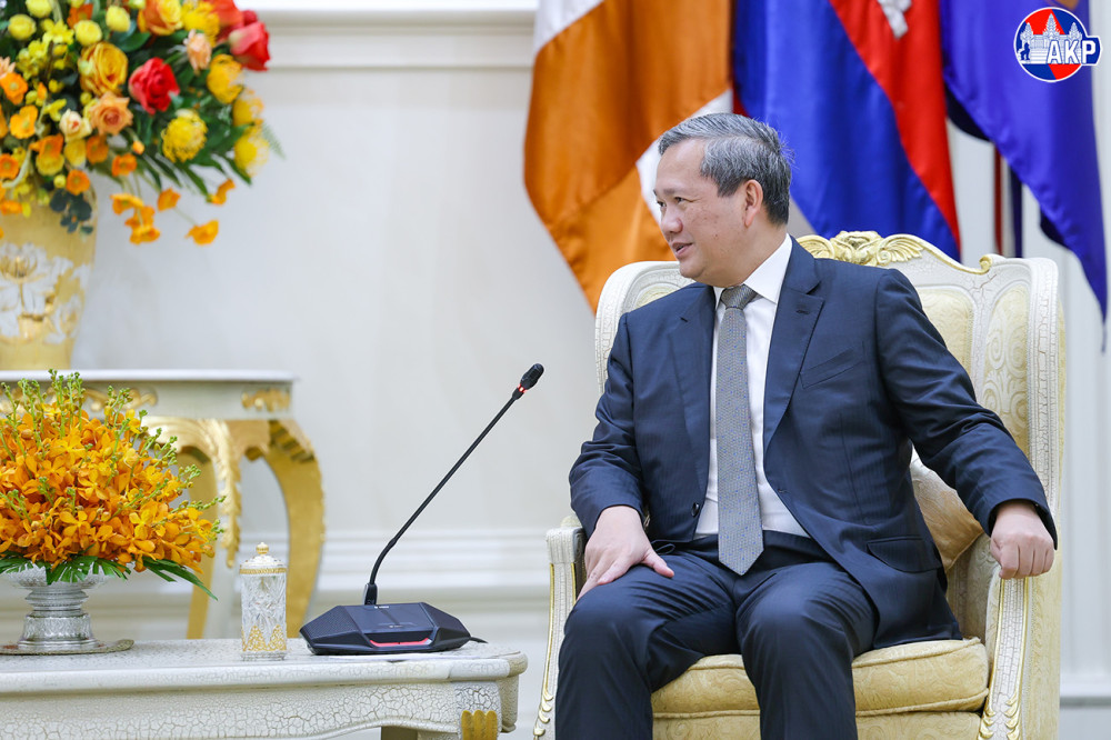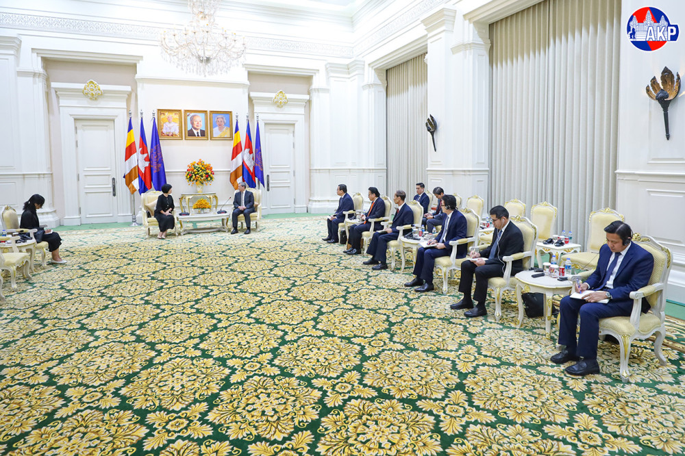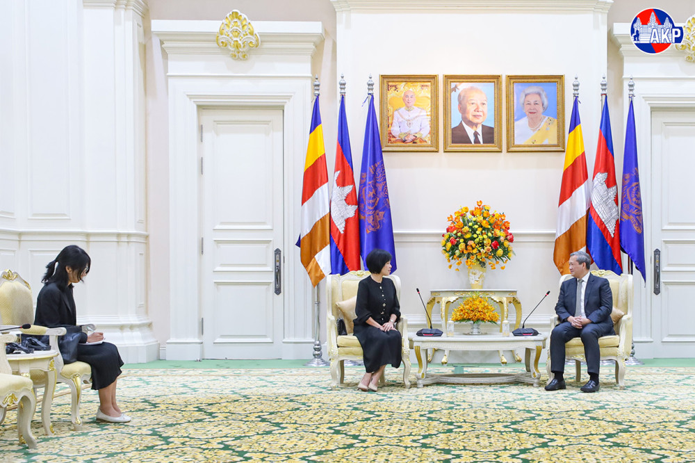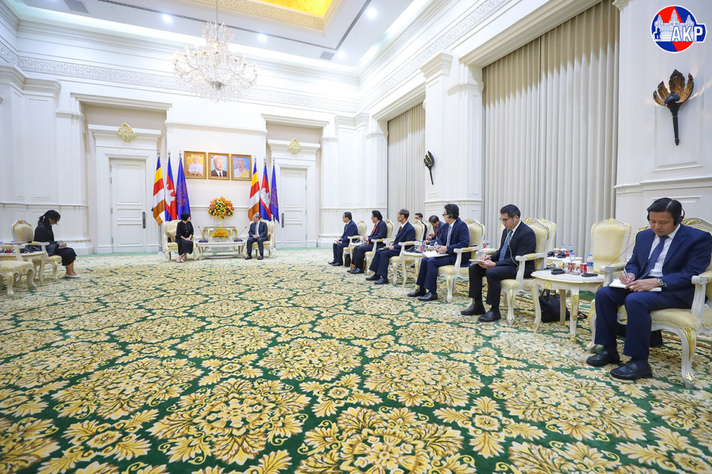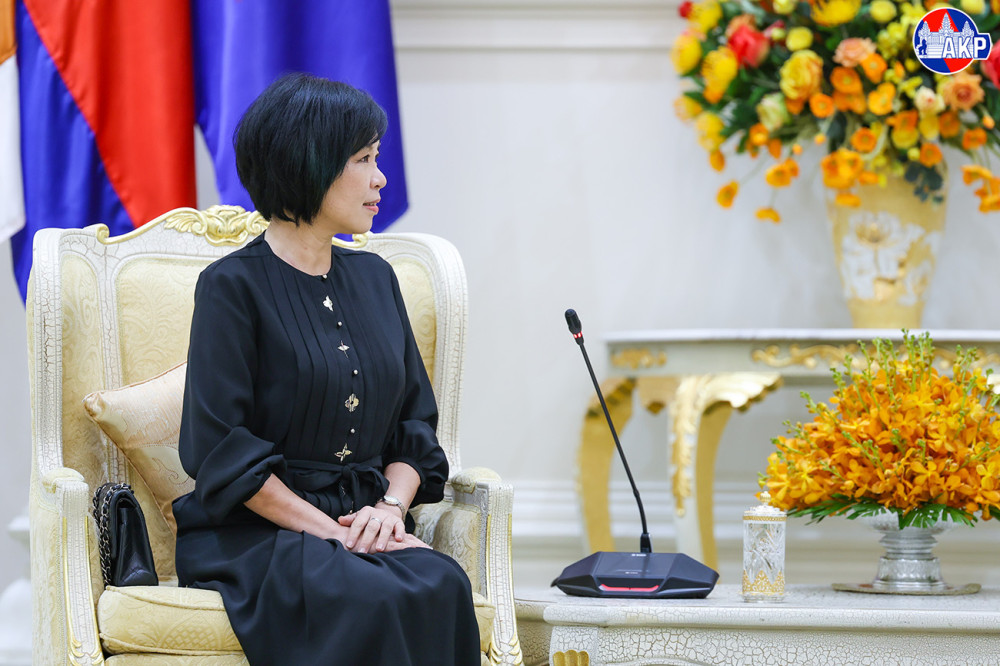 Samdech Moha Borvor Thipadei Manet (R, Pic. 1), Prime Minister of the Kingdom of Cambodia, receives a farewell visit from outgoing Singaporean Ambassador to Cambodia H.E. Ms. TEO Lay Cheng, at the Peace Palace in Phnom Penh this morning.