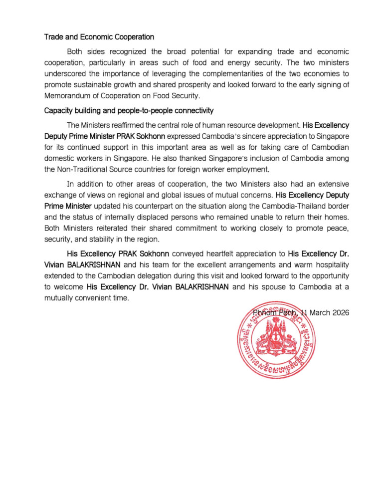 The following are the outcomes of the official visit of H.E. PRAK Sokhonn, Deputy Prime Minister, Minister of Foreign Affairs and international Cooperation of the Kingdom of Cambodia, to the Republic of Singapore, on Mar. 10-11: