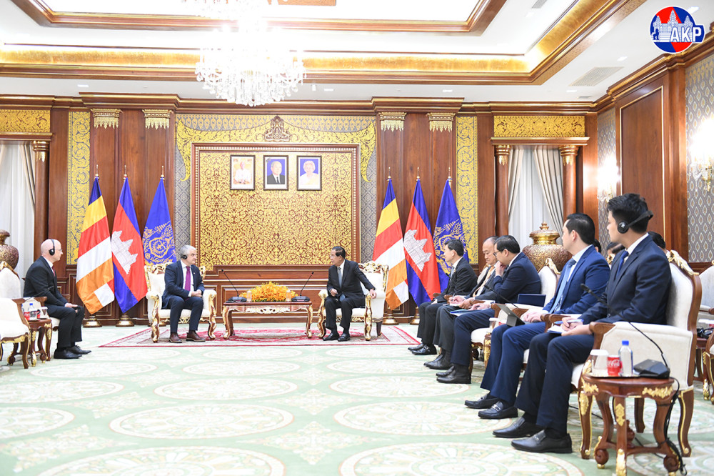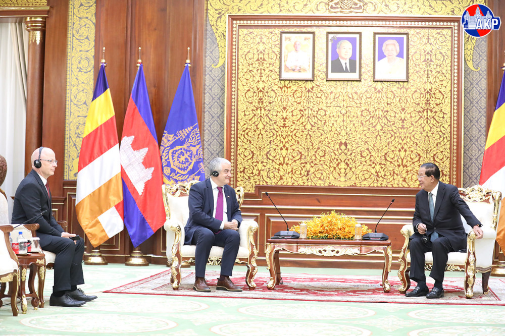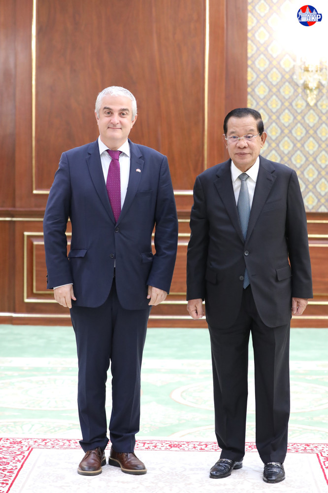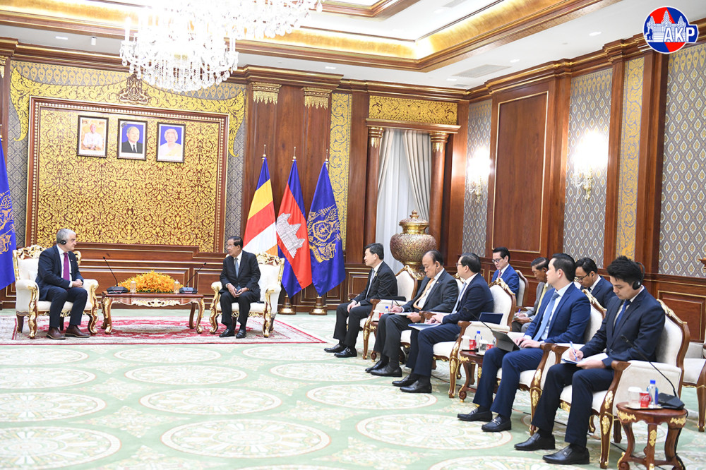 Samdech Akka Moha Sena Padei Techo Hun Sen (R, Pic. 1), Acting Head of State of the Kingdom of Cambodia, greets H.E. Danny Annan, Ambassador of the Kingdom of Denmark to the Kingdom of Cambodia, prior to the courtesy meeting, at the Solidarity Palace in Phnom Penh this morning.