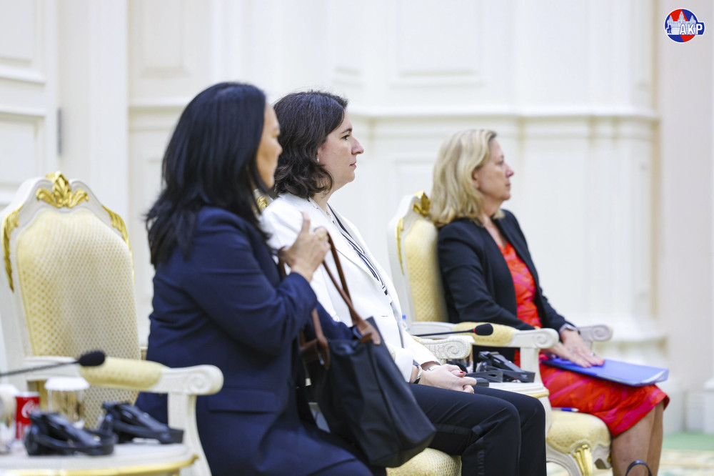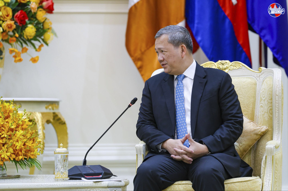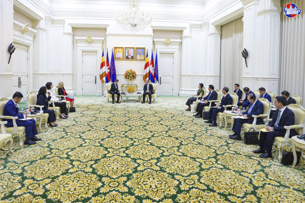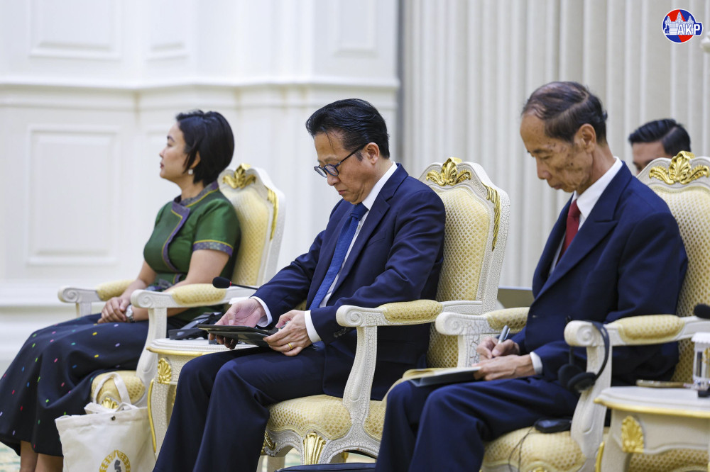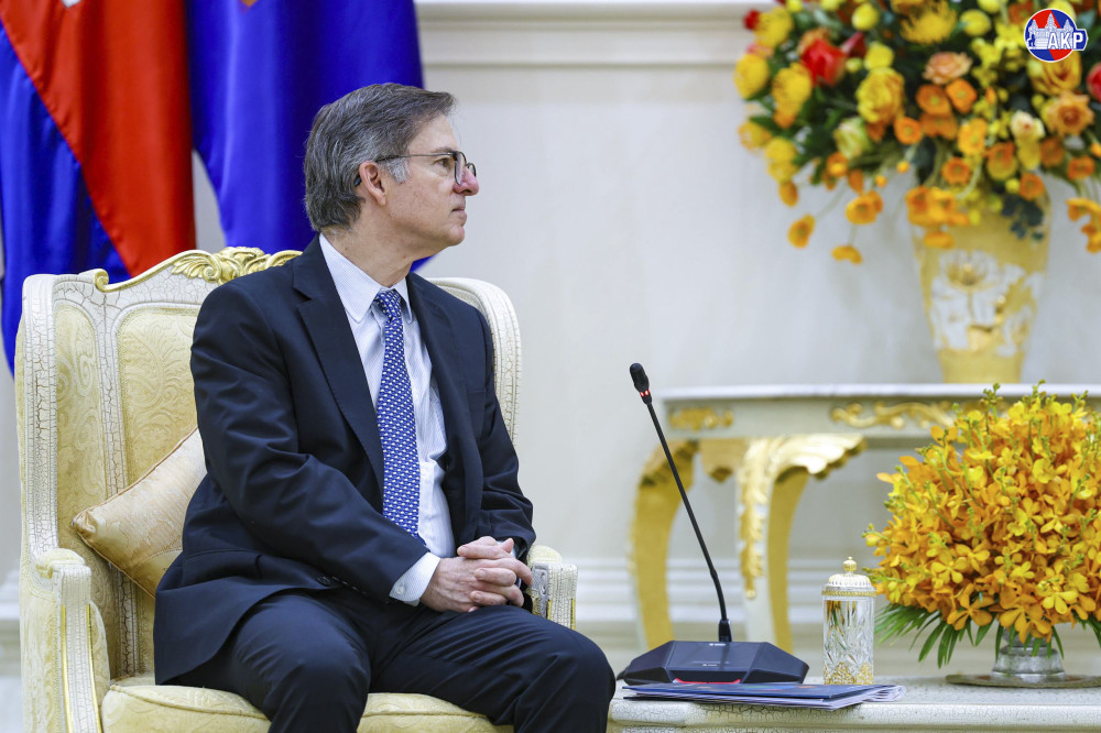 Samdech Moha Borvor Thipadei Hun Manet (R, Pic. 1), Prime Minister of the Kingdom of Cambodia, greets visiting H.E. Mr. Carlos Felipe Jaramillo, Vice President of the World Bank for East Asia and the Pacific, prior to the courtesy meeting at the Peace Palace in Phnom Penh this morning.