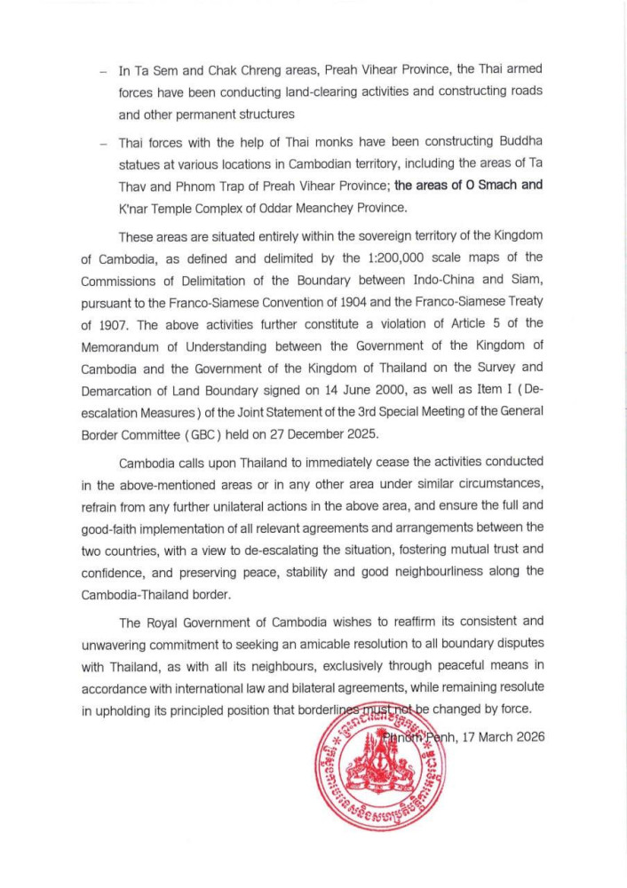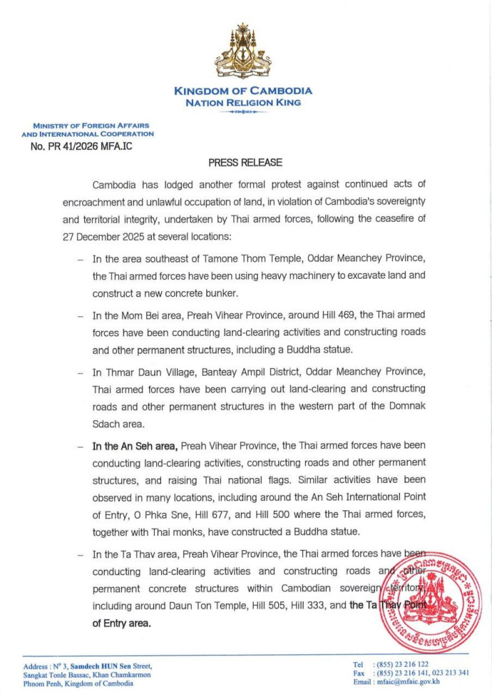 Cambodia Lodges Formal Protest Against Thailand’s Continued Encroachment and Unlawful Land Occupation