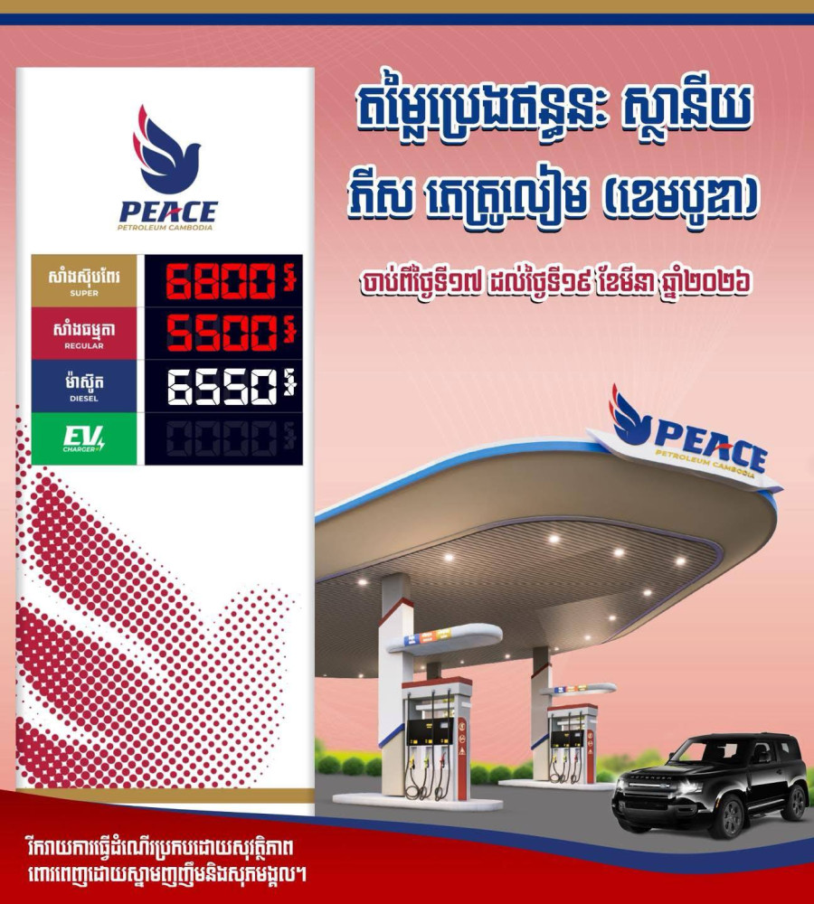Effective from Mar. 17 until further notice, the retail fuel prices in Cambodia were set at 5,500 Riel (US$1.37) per litter for regular petrol, and 6,550 Riel (US$1.63) per litter for diesel.