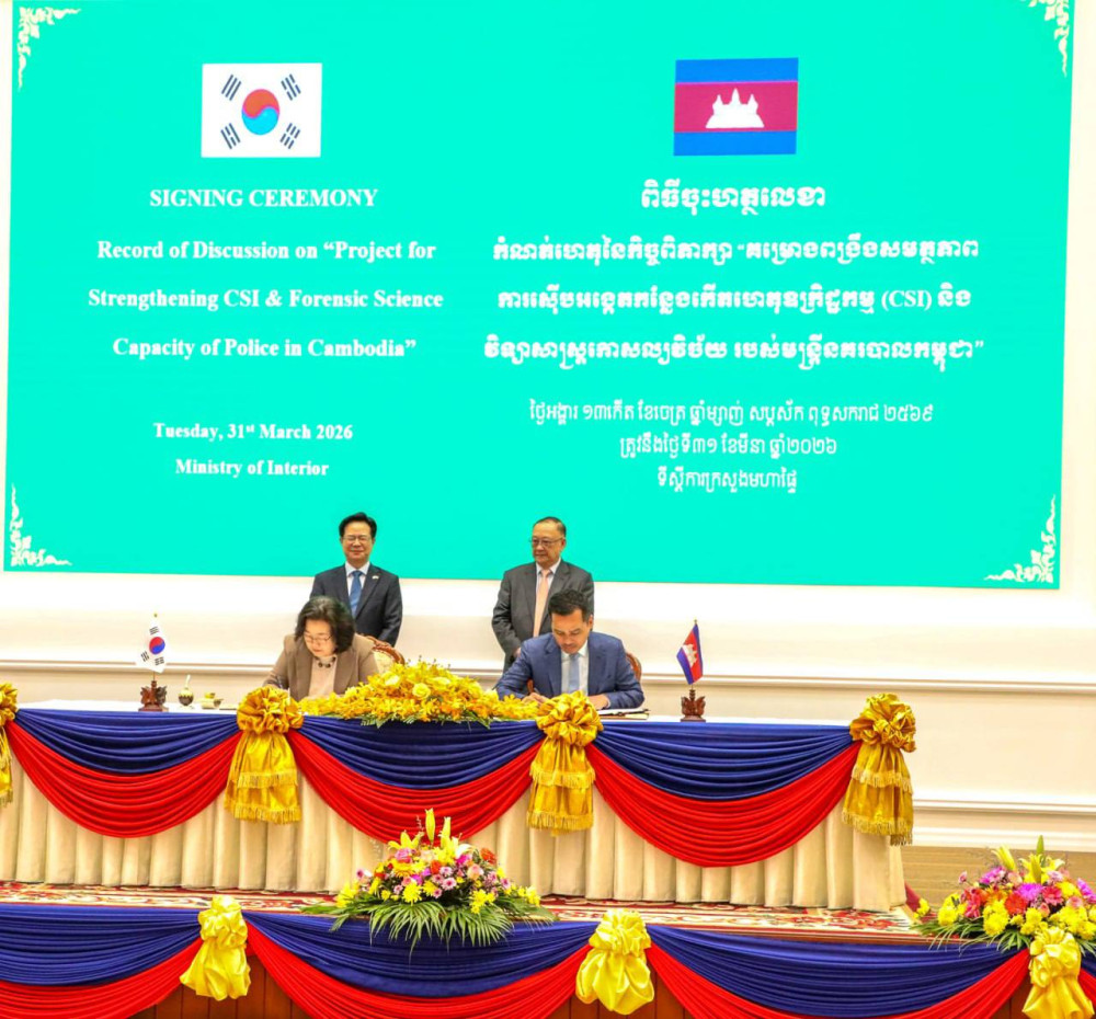 AKP Phnom Penh, March 31, 2026 -- The Ministry of Interior (MoI) and the Korea International Cooperation Agency (KOICA) have officially signed a Record of Discussion (RD) for the “Project for Strengthening CSI and Forensic Science Capacity of Police in Cambodia.”