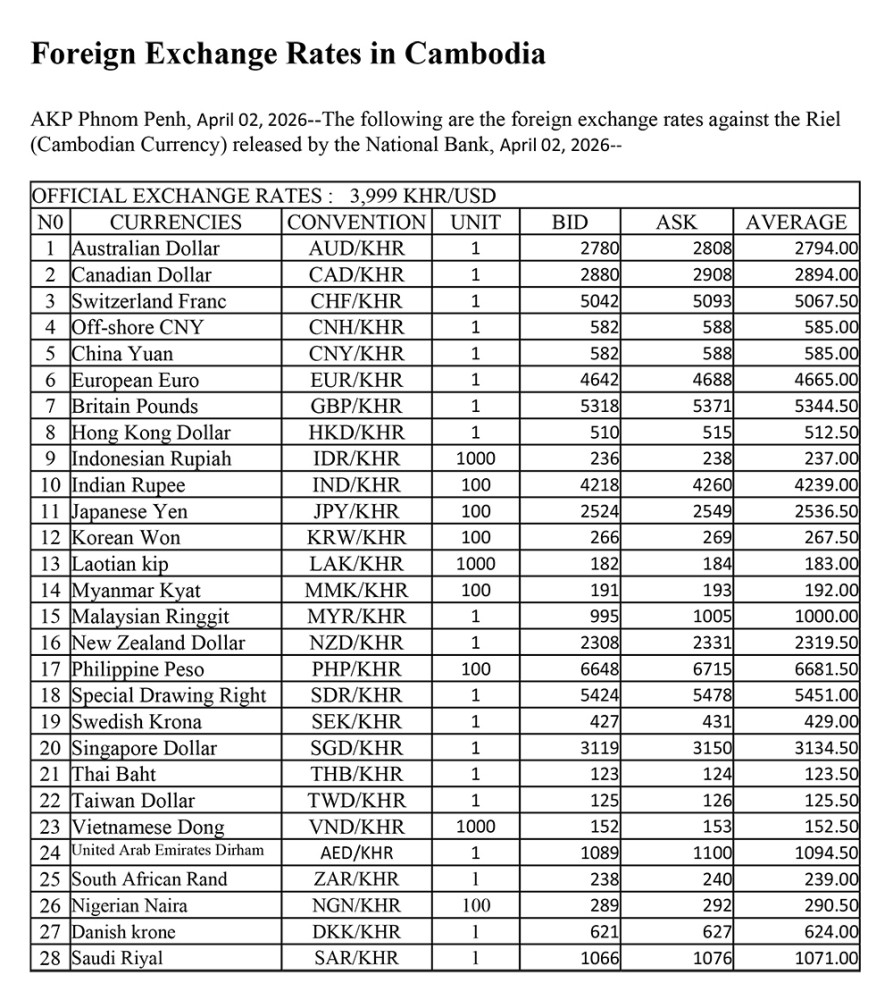 AKP Phnom Penh, April 02, 2026--The following are the foreign exchange rates against the Riel (Cambodian Currency) released by the National Bank, April 02, 2026--