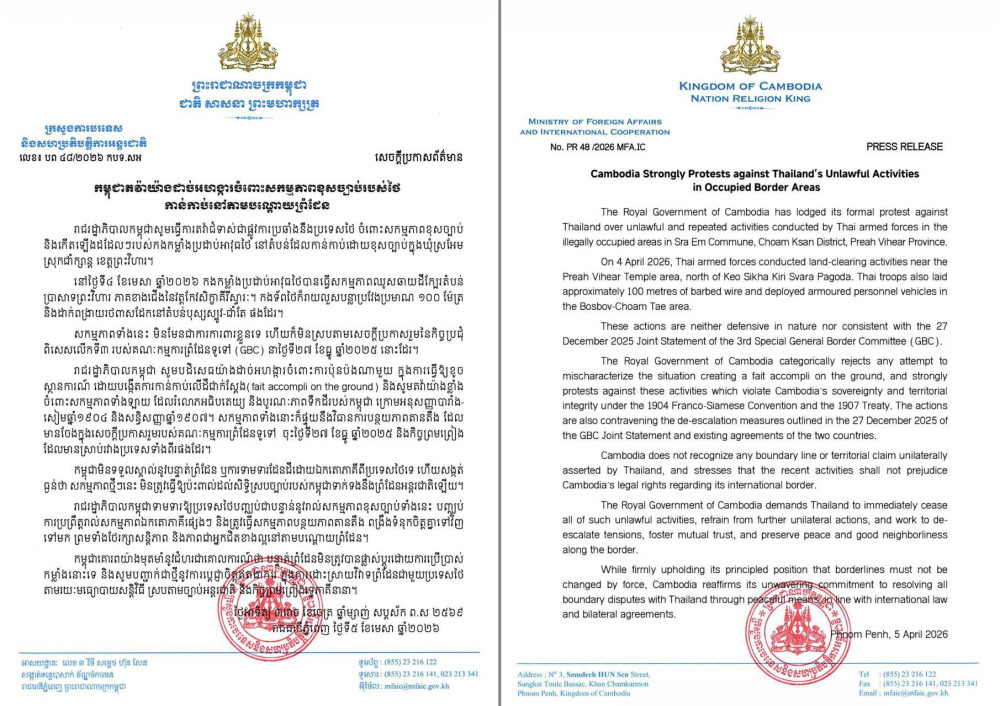 AKP Phnom Penh, April 05, 2026 -- The Royal Government of Cambodia has issued a strong protest against Thailand over unlawful and repeated activities by Thai armed forces in border areas of Preah Vihear province.