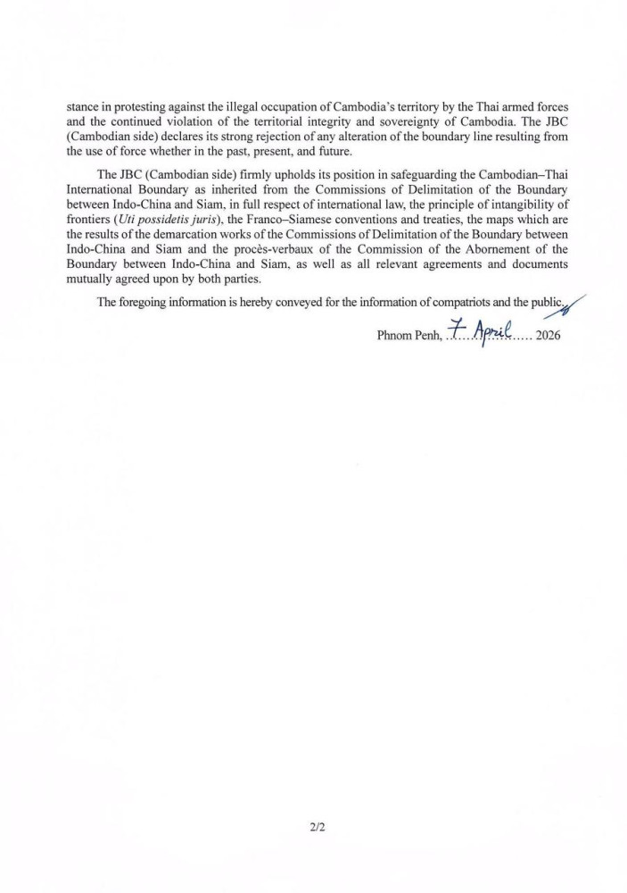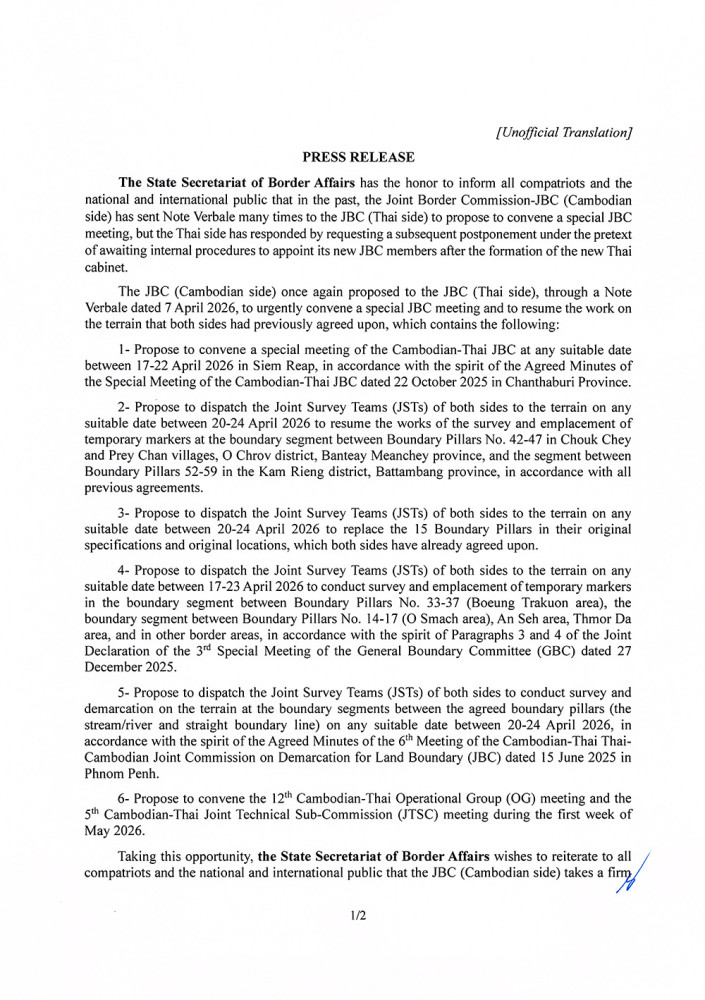 In its latest Note Verbale dated April 7, Cambodia proposed holding a special JBC meeting in Siem Reap between April 17 and 22, 2026, in line with previous agreements reached during a special session in Thailand’s Chanthaburi province in October 2025.