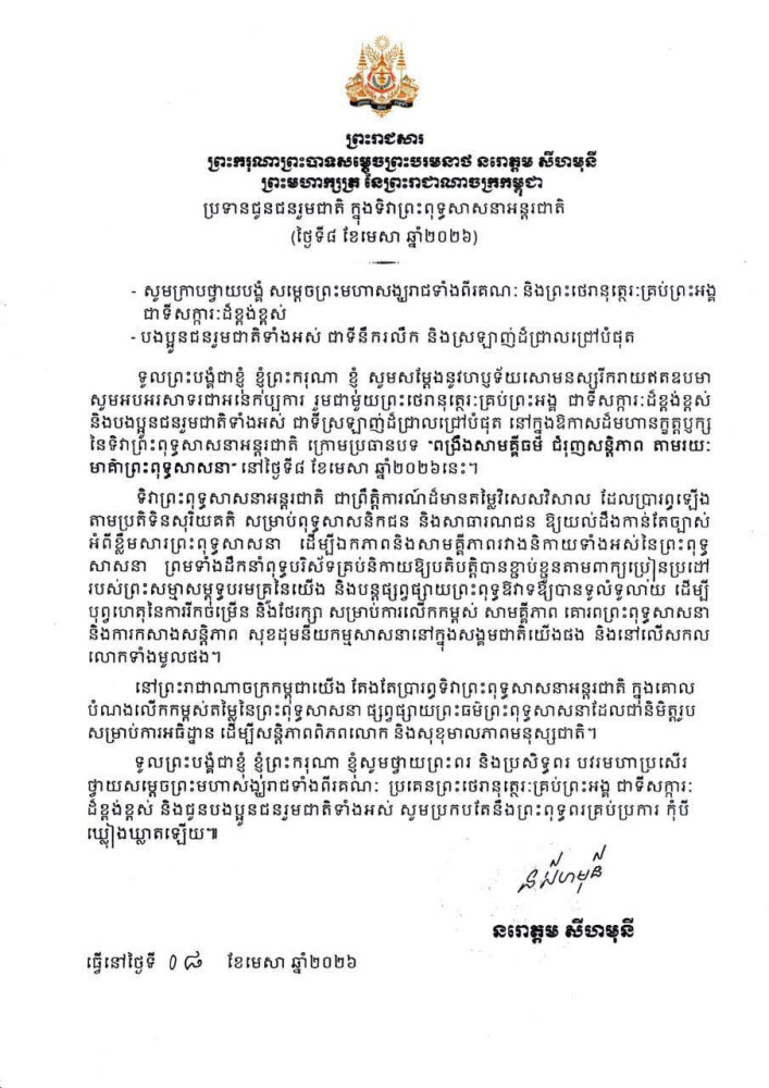 In a Royal Message issued to the nation on the occasion of International Buddhist Day on April 8, 2026, the King expressed his profound joy and extended his warmest congratulations to all Buddhist monks and Cambodian citizens across the country.