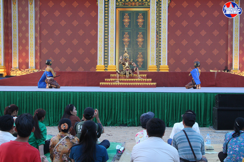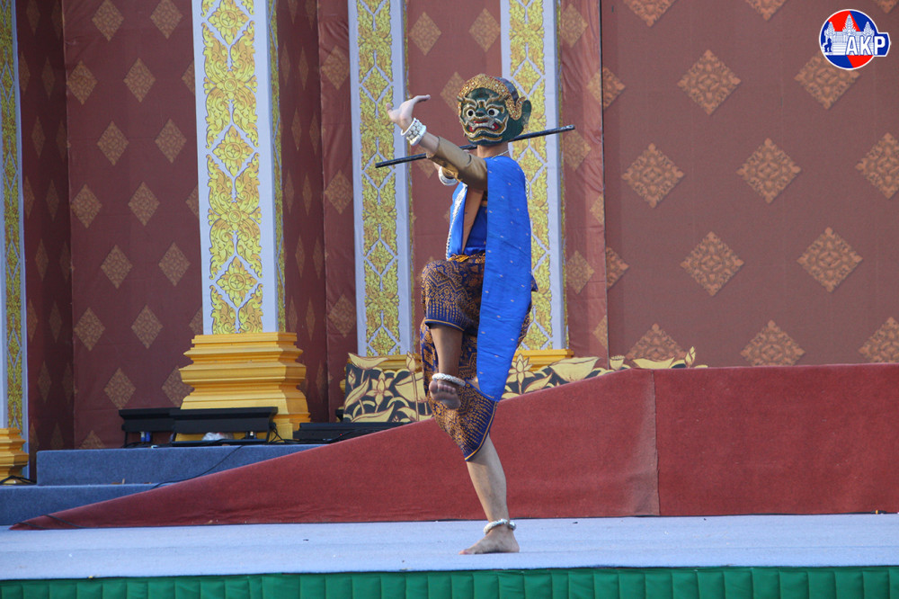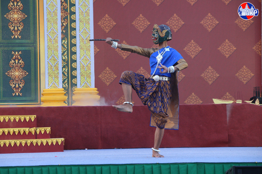 A scene from a Lakhon Khol performance, featuring the “Chambang Indrajit” (Battle of Indrajit), takes place at the Nokor Sankaranta Cultural Village this evening, the final day of the Khmer New Year festival.